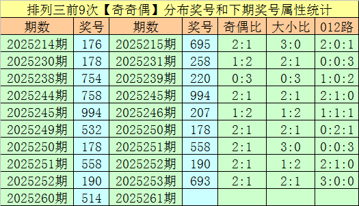 胪列三第2025260期奖号为514,直选奇偶散布为:奇奇偶,该奇偶散布历史上共出现了910次,前100期出现15次。