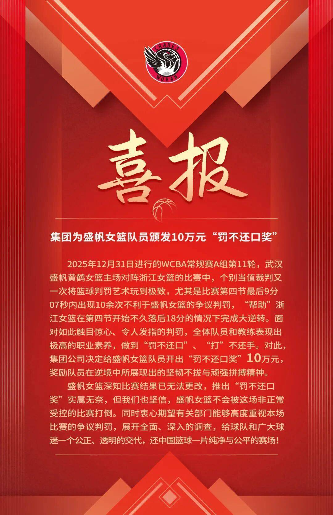 赛后,武汉盛帆集团决定给武汉盛帆女篮队员颁发10万元“罚不还口奖”,并发布“喜报”称:“深知比赛后果已无法更正,推出‘罚不还口奖’实属无奈,但咱们也笃信,盛帆女篮不会被这场非正常受控的比赛打倒。同期赤心期许干系部门八成高度青睐本场比赛的争议判罚,张开全面、深切的打听,给球队和弘远球迷一个公道、透明的打发,还中国篮球一派通俗与公说念的赛场!”