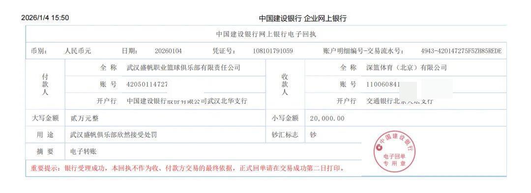 1月4日,武汉盛帆工作篮球俱乐部通过银行转账缴纳罚金2万元,比应交罚金还多了1万元。电子回捏的用途栏载明“武汉盛帆俱乐部安定接管处罚”。